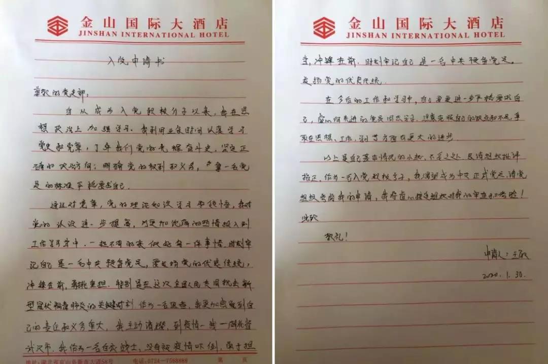1月30日,在武漢戰(zhàn)“疫”第一線,短短的兩天,讓青年護(hù)士王敏、王曉霞最驚訝、最感動(dòng)的就是防控疫情黨員先行,最危急的關(guān)頭、最危險(xiǎn)的地方總有共產(chǎn)黨員沖在前面,“我是黨員我先上”成為最響亮的口號(hào)。到達(dá)武漢的第二天,她們就向內(nèi)蒙古衛(wèi)健委成立的援助武漢臨時(shí)黨支部遞交了入黨申請(qǐng)書。她們表示,要在武漢防疫一線努力工作,向黨員同志學(xué)習(xí)、看齊,以實(shí)際行動(dòng)早日成為一名正式的共產(chǎn)黨員!