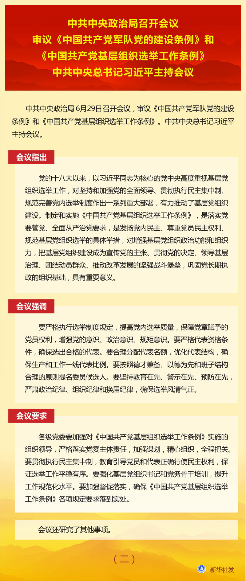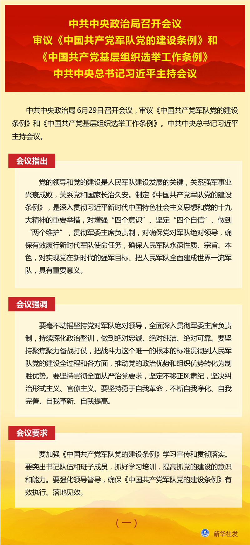 中共中央政治局召開會(huì)議 審議《中國共產(chǎn)黨軍隊(duì)黨的建設(shè)條例》和《中國共產(chǎn)黨基層組織選舉工作條例》 中共中央總書記習(xí)近平主持會(huì)議 新華社北京6月29日電 中共中央政治局6月29日召開會(huì)議,審議《中國共產(chǎn)黨軍隊(duì)黨的建設(shè)條例》和《中國共產(chǎn)黨基層組織選舉工作條例》。中共中央總書記習(xí)近平主持會(huì)議。 會(huì)議指出,黨的領(lǐng)導(dǎo)和黨的建設(shè)是人民軍隊(duì)建設(shè)發(fā)展的關(guān)鍵,關(guān)系強(qiáng)軍事業(yè)興衰成敗,關(guān)系黨和國家長治久安。制定《中國共產(chǎn)黨軍隊(duì)黨的建設(shè)條例》,是深入貫徹習(xí)近平新時(shí)代中國特色社會(huì)主義思想和黨的十九大精神的重要舉措,對增強(qiáng)“四個(gè)意識”、堅(jiān)定“四個(gè)自信”、做到“兩個(gè)維護(hù)”,貫徹軍委主席負(fù)責(zé)制,對確保黨對軍隊(duì)絕對領(lǐng)導(dǎo),確保有效履行新時(shí)代軍隊(duì)使命任務(wù),確保人民軍隊(duì)永葆性質(zhì)、宗旨、本色,對實(shí)現(xiàn)黨在新時(shí)代的強(qiáng)軍目標(biāo)、把人民軍隊(duì)全面建成世界一流軍隊(duì),具有重要意義。 會(huì)議強(qiáng)調(diào),要毫不動(dòng)搖堅(jiān)持黨對軍隊(duì)絕對領(lǐng)導(dǎo),全面深入貫徹軍委主席負(fù)責(zé)制,持續(xù)深化政治整訓(xùn),做到絕對忠誠、絕對純潔、絕對可靠。要堅(jiān)持聚焦聚力備戰(zhàn)打仗,把戰(zhàn)斗力這個(gè)唯一的根本的標(biāo)準(zhǔn)貫徹到人民軍隊(duì)黨的建設(shè)全過程和各方面,推動(dòng)黨的政治優(yōu)勢和組織優(yōu)勢轉(zhuǎn)化為制勝優(yōu)勢。要堅(jiān)持貫徹全面從嚴(yán)治黨要求,堅(jiān)定不移正風(fēng)肅紀(jì),堅(jiān)決糾治形式主義、官僚主義。要堅(jiān)持勇于自我革命,不斷自我凈化、自我完善、自我革新、自我提高。 會(huì)議要求,要加強(qiáng)《中國共產(chǎn)黨軍隊(duì)黨的建設(shè)條例》學(xué)習(xí)宣傳和貫徹落實(shí)。要突出書記隊(duì)伍和班子成員,抓好學(xué)習(xí)培訓(xùn),提高抓黨的建設(shè)的意識和能力。要強(qiáng)化領(lǐng)導(dǎo)督導(dǎo),確保《中國共產(chǎn)黨軍隊(duì)黨的建設(shè)條例》有效執(zhí)行、落地見效。 會(huì)議指出,黨的十八大以來,以習(xí)近平同志為核心的黨中央高度重視基層黨組織選舉工作,對堅(jiān)持和加強(qiáng)黨的全面領(lǐng)導(dǎo)、貫徹執(zhí)行民主集中制、規(guī)范完善黨內(nèi)選舉制度作出一系列重大部署,有力推動(dòng)了基層黨組織建設(shè)。制定和實(shí)施《中國共產(chǎn)黨基層組織選舉工作條例》,是落實(shí)黨要管黨、全面從嚴(yán)治黨要求,是發(fā)揚(yáng)黨內(nèi)民主、尊重黨員民主權(quán)利、規(guī)范基層黨組織選舉的具體舉措,對增強(qiáng)基層黨組織政治功能和組織力,把基層黨組織建設(shè)成為宣傳黨的主張、貫徹黨的決定、領(lǐng)導(dǎo)基層治理、團(tuán)結(jié)動(dòng)員群眾、推動(dòng)改革發(fā)展的堅(jiān)強(qiáng)戰(zhàn)斗堡壘,鞏固黨長期執(zhí)政的組織基礎(chǔ),具有重要意義。 會(huì)議強(qiáng)調(diào),要嚴(yán)格執(zhí)行選舉制度規(guī)定,提高黨內(nèi)選舉質(zhì)量,保障黨章賦予的黨員權(quán)利,增強(qiáng)黨的意識、政治意識、規(guī)矩意識。要嚴(yán)格代表資格條件,確保選出合格的代表。要合理分配代表名額,優(yōu)化代表結(jié)構(gòu),確保生產(chǎn)和工作一線代表比例。要按照德才兼?zhèn)?、以德為先和班子結(jié)構(gòu)合理的原則提名委員候選人。要堅(jiān)持教育在先、警示在先、預(yù)防在先,嚴(yán)肅政治紀(jì)律、組織紀(jì)律和換屆紀(jì)律,確保選舉風(fēng)清氣正。 會(huì)議要求,各級黨委要加強(qiáng)對《中國共產(chǎn)黨基層組織選舉工作條例》實(shí)施的組織領(lǐng)導(dǎo),嚴(yán)格落實(shí)黨委主體責(zé)任,加強(qiáng)謀劃,精心組織,全程把關(guān)。要貫徹執(zhí)行民主集中制,教育引導(dǎo)黨員和代表正確行使民主權(quán)利,保證選舉工作平穩(wěn)有序。要強(qiáng)化基層黨組織書記和黨務(wù)骨干培訓(xùn),提升工作規(guī)范化水平。要加強(qiáng)督促落實(shí),確?!吨袊伯a(chǎn)黨基層組織選舉工作條例》各項(xiàng)規(guī)定要求落到實(shí)處。 會(huì)議還研究了其他事項(xiàng)。 |