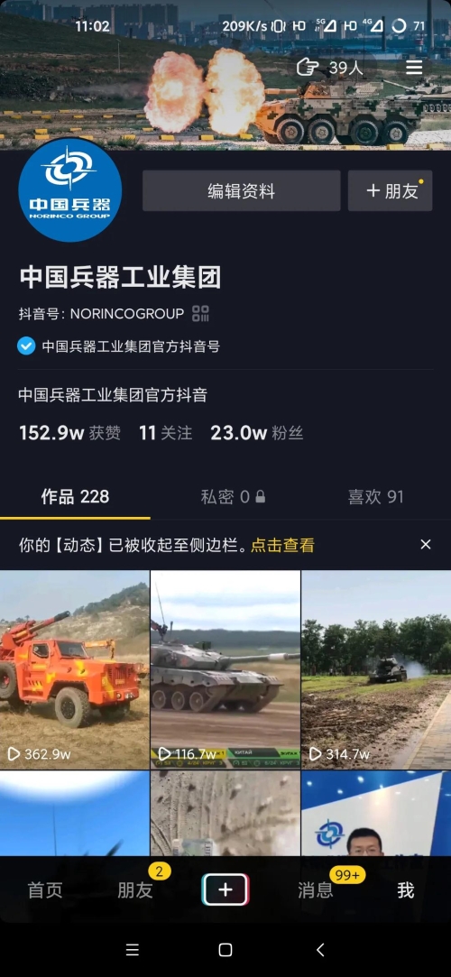 近日 中國兵器工業(yè)集團(tuán)抖音號(hào) 喜獲殊榮 成為2020年政務(wù)抖音號(hào) 優(yōu)秀創(chuàng)作者 2020年1月 集團(tuán)公司抖音號(hào)正式開通 近1年來,短視頻宣傳取得良好效果 截至目前,共發(fā)布視頻228個(gè) 總粉絲數(shù)23萬,獲贊152萬 播放總量已超8000萬 |