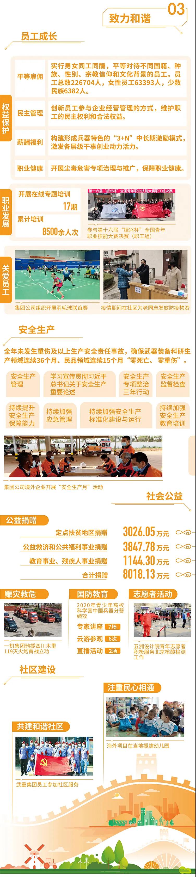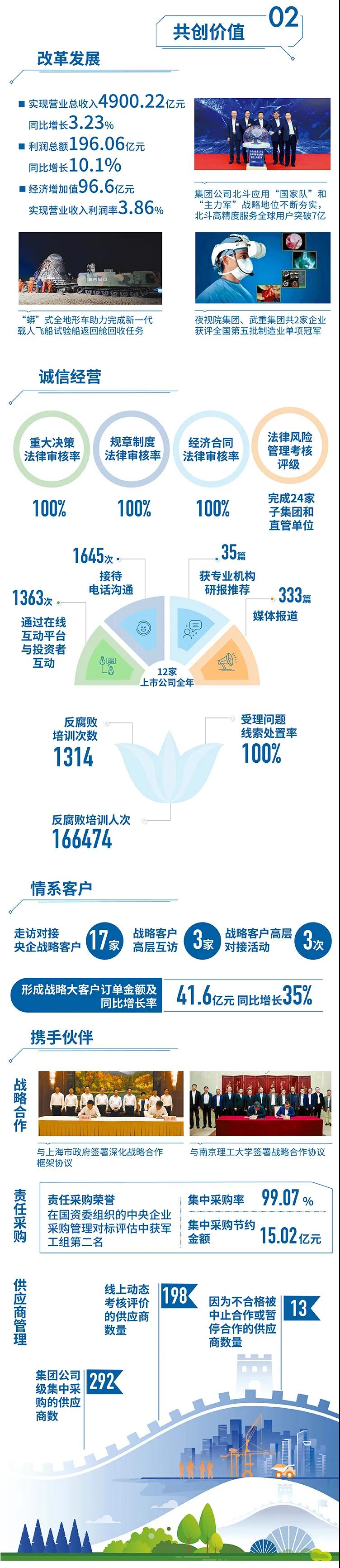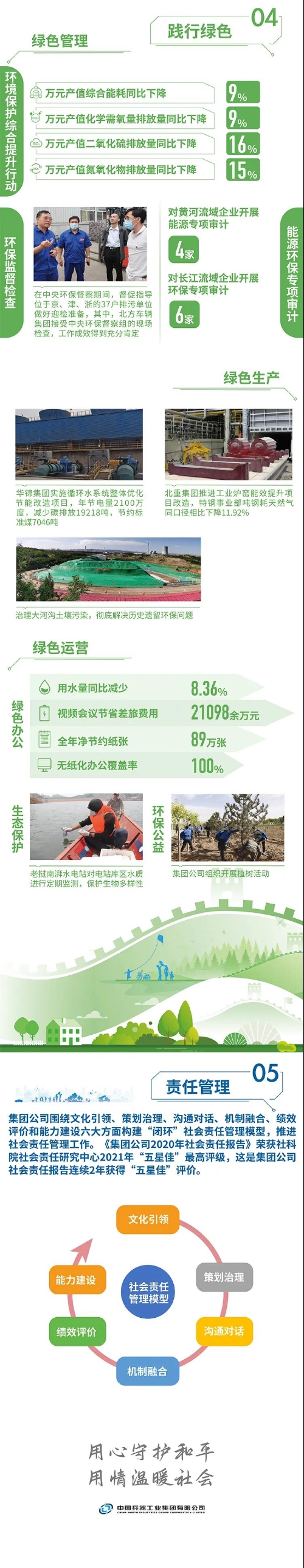 2020年,是“十三五”規(guī)劃收官之年,也是全面建成小康社會、實現(xiàn)第一個百年目標的決勝之年。集團公司黨組書記、董事長焦開河在報告開篇指出,集團公司實現(xiàn)了“十三五”圓滿收官,整體步入了高質量發(fā)展軌道,呈現(xiàn)出基礎更牢、動力更強、空間更大、效能更高的積極向上良好態(tài)勢。在“十三五”特別是近三年來的工作實踐中,我們明確了“集團公司是國家安全和國防建設的脊梁、是國家戰(zhàn)略科技力量最為重要的組成部分、是黨和國家最可信賴的‘六個力量’,肩負著支撐國防軍隊建設、推動科技自立自強、服務構建新發(fā)展格局的重大政治責任和光榮使命,具有極強的政治屬性,性質特殊、使命特殊、責任特殊”的新時代新階段職責使命,深化了對“堅持以習近平新時代中國特色社會主義思想定向領航,是集團公司高質量發(fā)展的根本遵循;保持貫徹落實習近平總書記重要指示批示和黨中央決策部署的戰(zhàn)略定力,是集團公司高質量發(fā)展的根本前提;履行好強軍這個首要職責,是集團公司高質量發(fā)展的根本要求;加快兵器科技創(chuàng)新突破,是集團公司高質量發(fā)展的根本支撐;加強黨的領導黨的建設,是集團公司高質量發(fā)展的根本保證”的兵器工業(yè)改革發(fā)展規(guī)律認識。 《報告》聚焦“抗疫斗爭中的‘兵器力量’”,生動展示了集團公司抗擊疫情的有力行動,展現(xiàn)了集中力量辦大事、急國家之所急的“兵器速度”,彰顯了“把一切獻給黨”的人民兵工精神和貫徹落實國家決策部署的責任擔當?!秷蟾妗芬浴坝眯氖睾蚝推?、用情溫暖社會”為主題,從恪守本責、共創(chuàng)價值、致力和諧、踐行綠色、責任管理五個維度,全面展現(xiàn)集團公司在堅持履行政治責任、經濟責任、社會責任,履行強軍首責、加強黨的建設、打造國家戰(zhàn)略科技力量、推進“一帶一路”倡議、打好打贏三大攻堅戰(zhàn)、深化改革、助力員工成長、支持社會公益事業(yè)、提升社會責任管理等方面的生動實踐和履責亮點,凸顯集團公司保持貫徹落實黨中央決策部署的戰(zhàn)略定力、在聚焦主責主業(yè)、科技引領、國際化經營上持續(xù)用力,為實現(xiàn)第一個百年奮斗目標貢獻力量的初心與行動。《報告》再次獲得中國企業(yè)社會責任報告評級專家委員會“五星佳”最高評級,兵器工業(yè)集團成為軍工行業(yè)唯一連續(xù)10年獲得最高評級的企業(yè)。 2021年是開啟新征程的開局之年,也是建黨100周年、人民兵工創(chuàng)建90周年,兵器工業(yè)集團將全面貫徹落實黨中央戰(zhàn)略部署,緊扣推動高質量發(fā)展主題,圍繞“十四五”開好局、起好步,堅決完成黨中央賦予的職責使命,履行好中央企業(yè)和軍工集團的政治責任、經濟責任、社會責任,為實現(xiàn)中國夢強軍夢作出新的更大貢獻! 一圖看懂《中國兵器工業(yè)集團有限公司2020年社會責任報告》