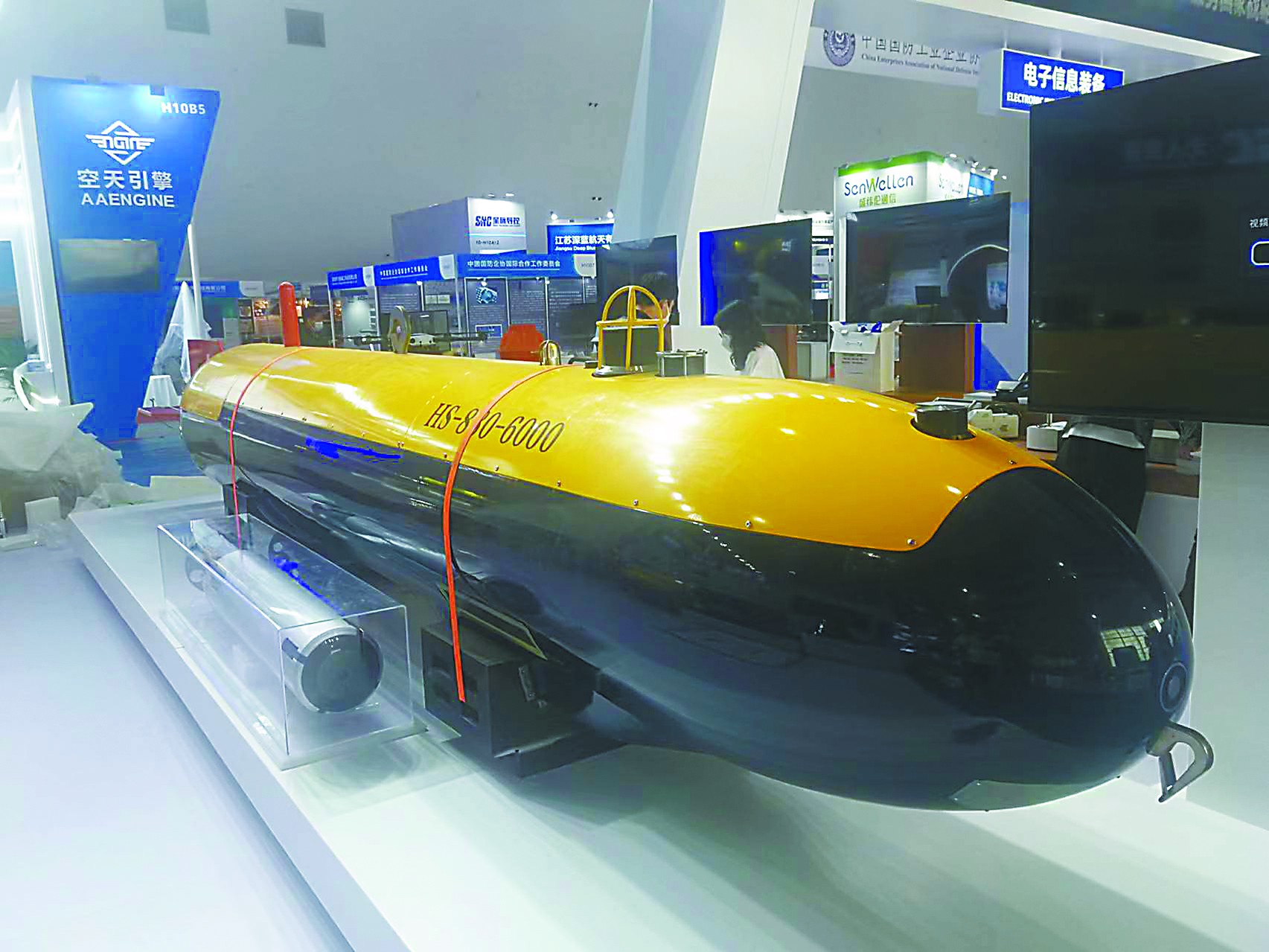 相比公眾相對(duì)熟悉的無(wú)人機(jī)和無(wú)人車,無(wú)人船和無(wú)人潛航器的知名度略低,但本屆珠海航展上展出的相關(guān)裝備具備相當(dāng)高的水平。例如HS-880-6000型自主式水下航行器(AUV)就是國(guó)內(nèi)首型搜救型無(wú)人潛航器。它的最大工作深度達(dá)6000米,能以3節(jié)的速度連續(xù)航行24小時(shí),配備有深水遇險(xiǎn)目標(biāo)高分辨低照度照明系統(tǒng)、聲信標(biāo)定向引導(dǎo)聲吶、水聲探測(cè)側(cè)掃聲吶等,具備工作水深范圍寬、載荷能力大、續(xù)航力長(zhǎng)、搜尋探測(cè)能力強(qiáng)等特點(diǎn),可對(duì)深海目標(biāo)全自主精細(xì)搜尋、探測(cè)、定位,執(zhí)行深海水下目標(biāo)搜尋探測(cè)和海洋科學(xué)研究任務(wù)。另一款“守望者”無(wú)人潛航器個(gè)頭小巧,配備有光學(xué)探頭、戰(zhàn)斗部和通信設(shè)備,可以自動(dòng)靠近水中或海底目標(biāo)進(jìn)行觀測(cè)、毀傷目標(biāo),用于執(zhí)行反水雷、排障、海底管道巡檢等任務(wù)。