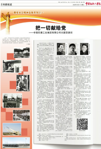 1月6日,貫徹落實中央企業(yè)黨的建設工作座談會精神專題推進會在京召開。會上,中國兵器工業(yè)集團有限公司等5家單位作了“賡續(xù)央企精神血脈”主題宣講報告。3月21日,《中國組織人事報》刊發(fā)賡續(xù)央企精神血脈系列之一——《把一切獻給黨——中國兵器工業(yè)集團有限公司主題宣講詞》。
