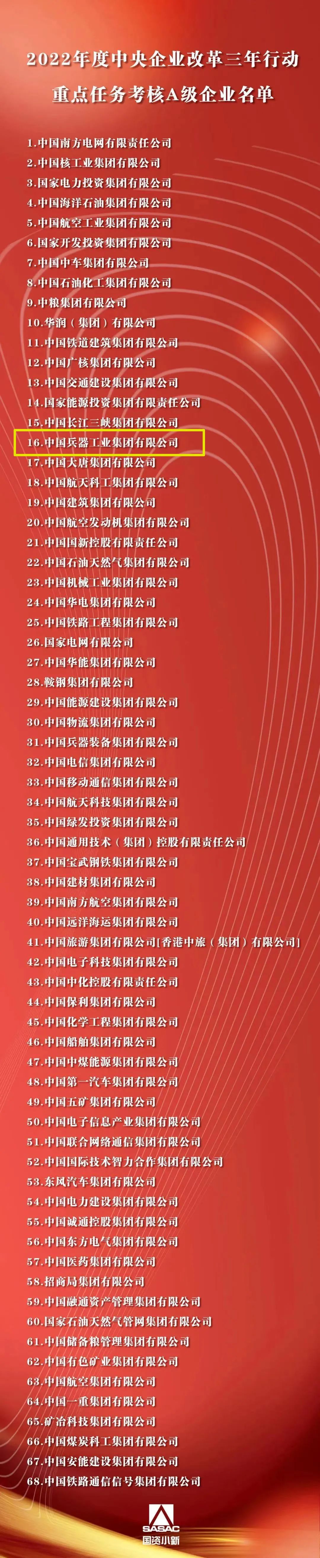 根據(jù)《中央企業(yè)改革三年行動(dòng)重點(diǎn)任務(wù)考核實(shí)施方案(試行)》和《中央企業(yè)改革三年行動(dòng)重點(diǎn)任務(wù)考核指標(biāo)表(2022版)》,經(jīng)審定,國(guó)務(wù)院國(guó)資委發(fā)布2022年度中央企業(yè)改革三年行動(dòng)重點(diǎn)任務(wù)考核A級(jí)企業(yè)名單,中國(guó)兵器工業(yè)集團(tuán)有限公司獲評(píng)A級(jí)。
