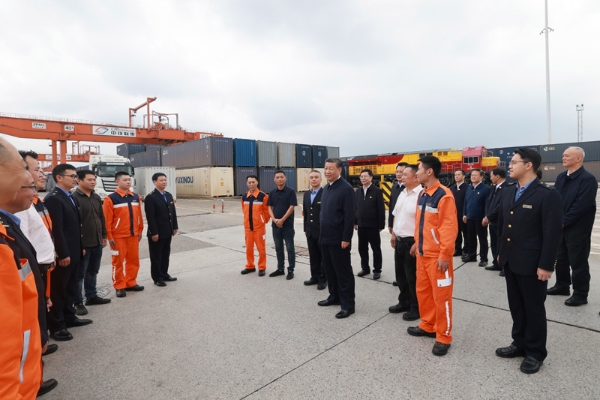 隨后,習近平來到重慶鐵路集裝箱中心站,聽取貨物集散、運輸路徑、運營成本和效益等介紹,同貨車司機、列車司機、裝卸工人、場站管理人員等親切交流,詢問他們的工作強度、勞動保護、節(jié)假日休息和收入情況。習近平說,大家在物流一線,也是在對外開放一線,通過你們的辛勤勞動,很多商品跨越山海、走向世界,你們的工作很有意義。推動西部大開放、促進西部大開發(fā),物流很重要,大家要繼續(xù)努力,不斷創(chuàng)造新的業(yè)績,作出新的貢獻。