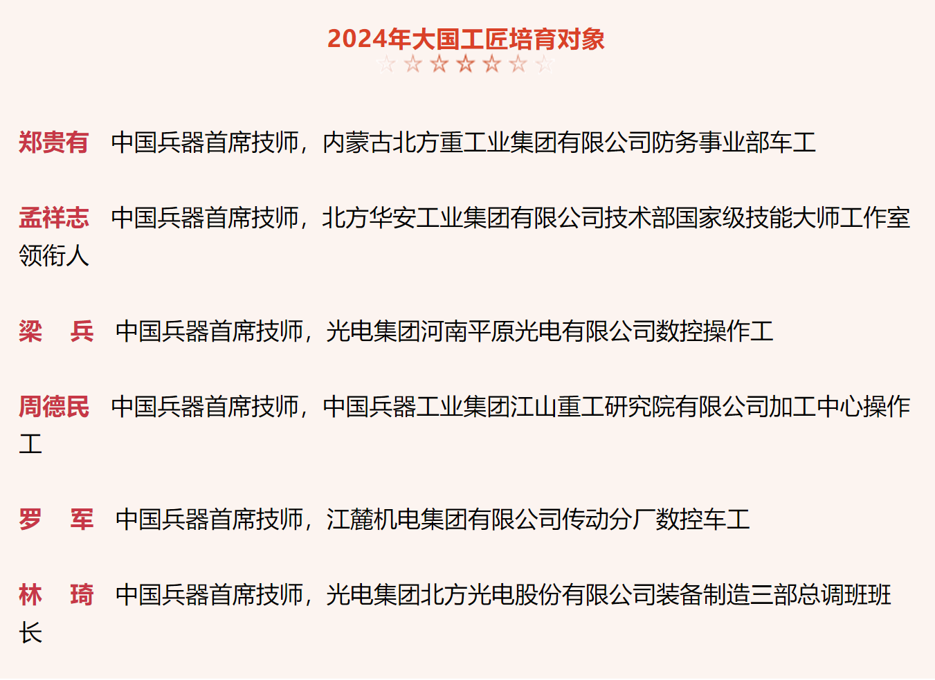 兵器工業(yè)集團(tuán)6名高技能人才入選2024年大國工匠培育對象名單 |