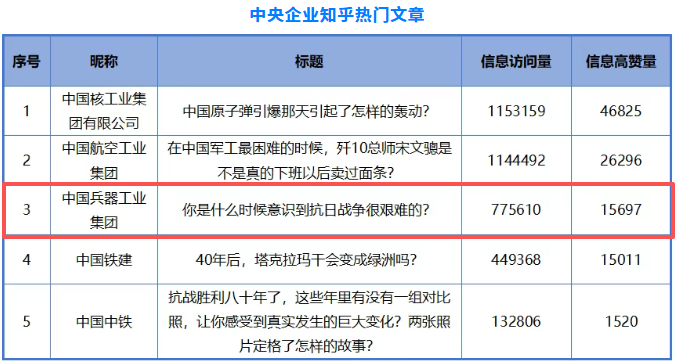 1月3日,國務(wù)院國資委新聞中心聯(lián)合清華大學(xué)新聞與傳播學(xué)院、中國企業(yè)聯(lián)合會,發(fā)布“2025年度中國企業(yè)新媒體指數(shù)”,通過平臺作品數(shù)、播放量、點贊數(shù)、評論數(shù)等維度綜合評估,評選出各中央企業(yè)在微信、微博、視頻號、抖音、快手、今日頭條、知乎、Bilibili等新媒體平臺的5部熱門作品。 兵器工業(yè)集團(tuán)兩部作品入選,其中: 《亮家底兒,曬太陽!西藏軍區(qū)某裝備保養(yǎng)大場面來了!》入選中央企業(yè)今日頭條熱門文章。 《你是什么時候意識到抗日戰(zhàn)爭很艱難的?》入選中央企業(yè)知乎熱門文章。 |