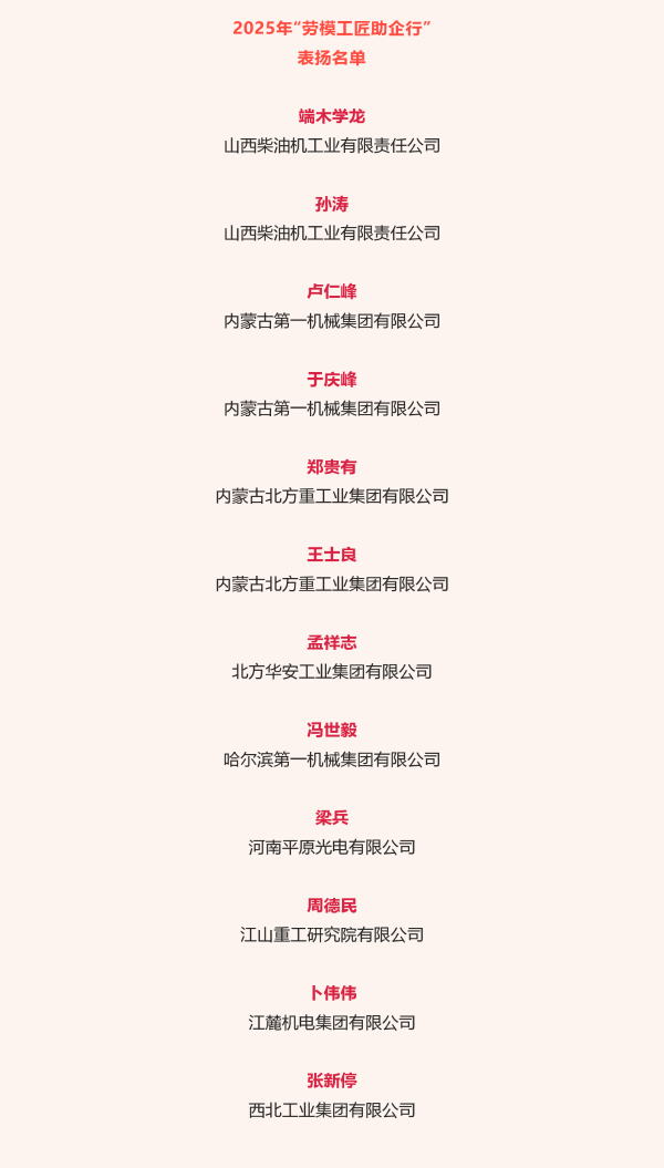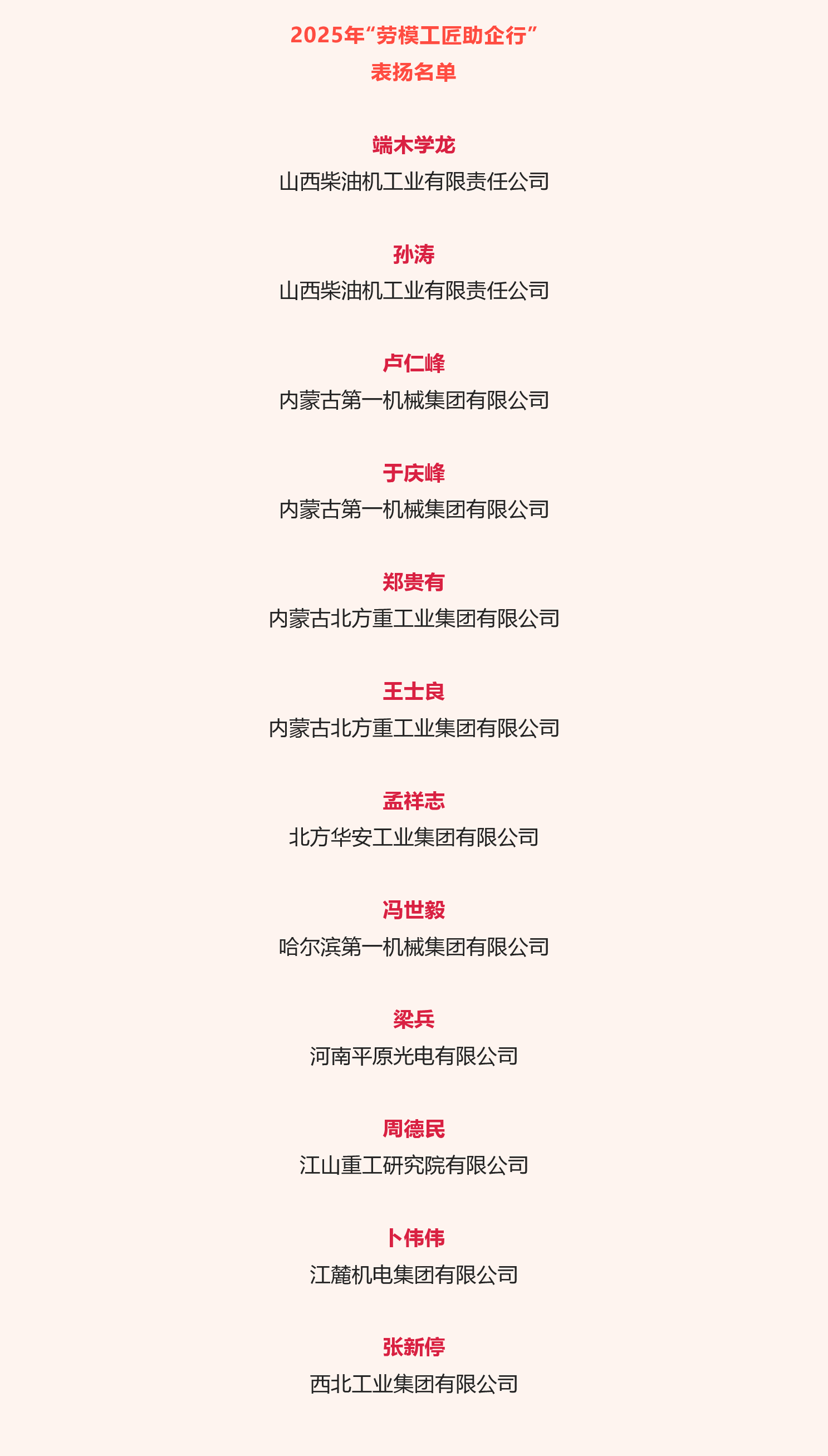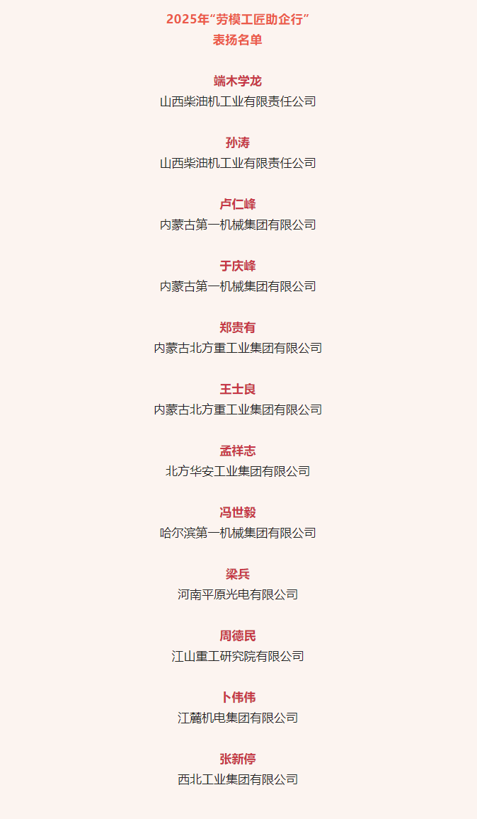 近日,中華全國總工會(huì)公布2025年“勞模工匠助企行”表揚(yáng)名單,兵器工業(yè)集團(tuán)12名勞模工匠入選。